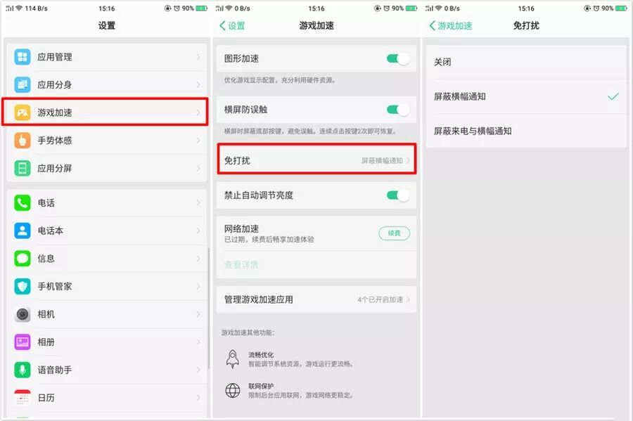 那么,OPPO R11s 的游戏免打扰功能要怎么开启呢? 很简单,只要依次点击手机的“设置”——“游戏加速”——“免打扰”,然后勾选想要设置的两种免打扰模式就可以啦! |