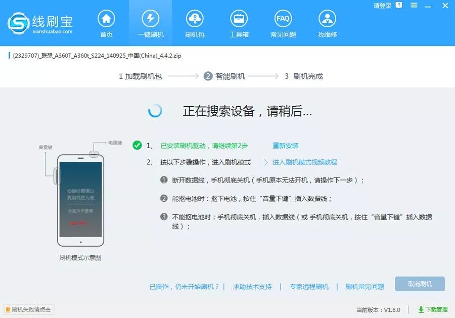 如果上面的准备工作做好了,刷机是一件非常容易的事情。分为三个小步骤: 1、在电脑上下载安装线刷宝客户端。一路点“下一步”就可以了。 2、打开客户端,搜索刷机包,找到以后点击“一键刷机”,一直等到线刷宝进入刷机提示界面(就是下面这个样子的)。 3、看着上面的说明,操作你的手机,然后将手机连接电脑。然后等着就行了,手机会自动进行刷机,然后直到手机重启。 |